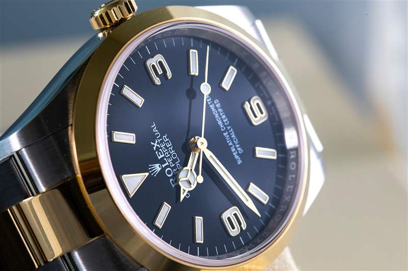 雖然表盤仍然是經(jīng)典的3-6-9 Explorer表盤,具有光澤的黑色漆面,但最近的縮小確實(shí)影響了一些小元素,在這里和那里。“Explorer”文字已從六點(diǎn)鐘位置移回12點(diǎn)鐘位置,“最高級天文臺(tái)表/官方認(rèn)證”簽名的間距更大,以填補(bǔ)下半部分。這可能是一些奇怪的視覺錯(cuò)覺,但在我看來,新表盤看起來比214270上的表盤更干凈,更不局促,盡管將相同的信息打包在更少的空間中。在雙色版本的手表上,金色指針和刻度增添了大量的視覺溫暖,讓我想起了20世紀(jì)60年代初的鍍金表盤。