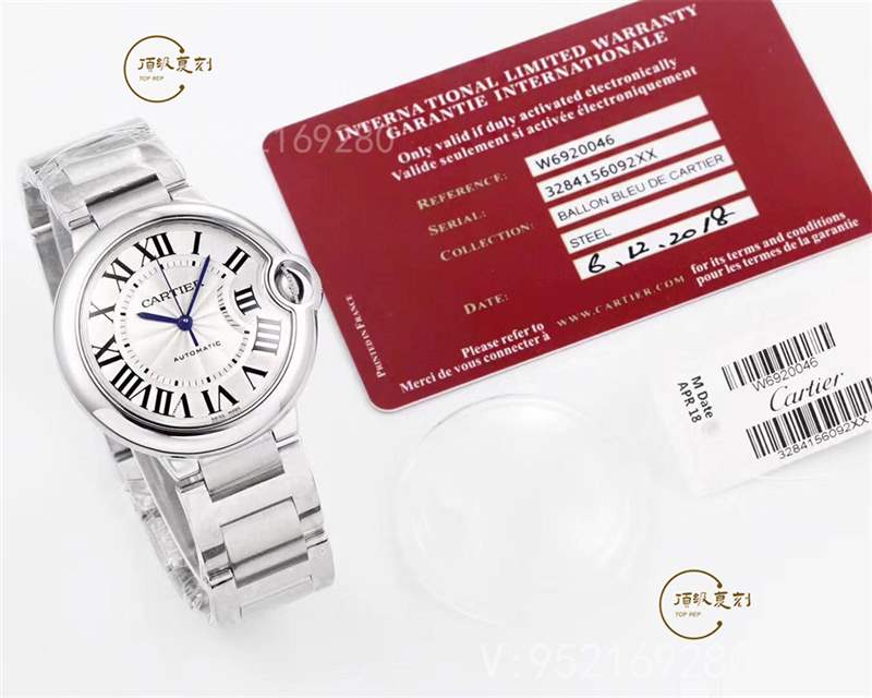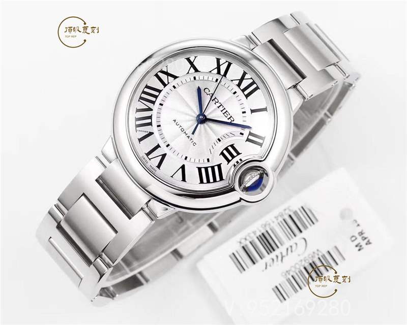 這款卡地亞藍氣球腕表為36毫米表款,表徑36.6毫米,厚度為12.05毫米,內部搭載自動上鏈機械機芯。精鋼表殼上裝配凹槽式表冠,鑲嵌一顆凸圓形合成尖晶石。腕表使用鍍銀珠光扭索雕紋表盤,羅馬數字時標,劍形藍鋼指針,覆蓋抗磨損藍寶石水晶鏡面,使用精鋼表鏈。防水深度30米。V6廠終極版卡地亞藍氣球36mm腕表,所有尺寸與正品一致,功能一致,細節突出。