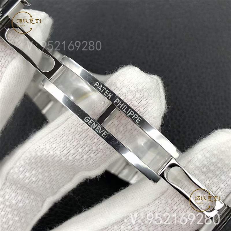 316L精鋼材質打造,整條表帶打磨質感非常不錯,表帶的每一節都有倒角打磨。所以佩戴起來不刮手。Nautilus折疊式表扣。帶fliplock保險扣。打開扣子之后里面的兩排刻字,刻的深度也是一樣的。