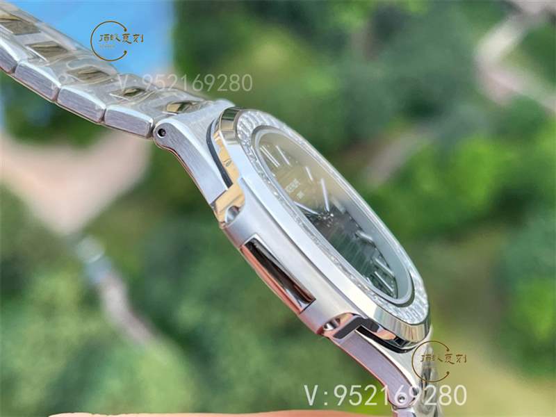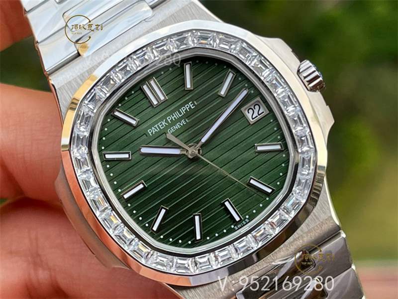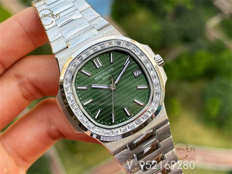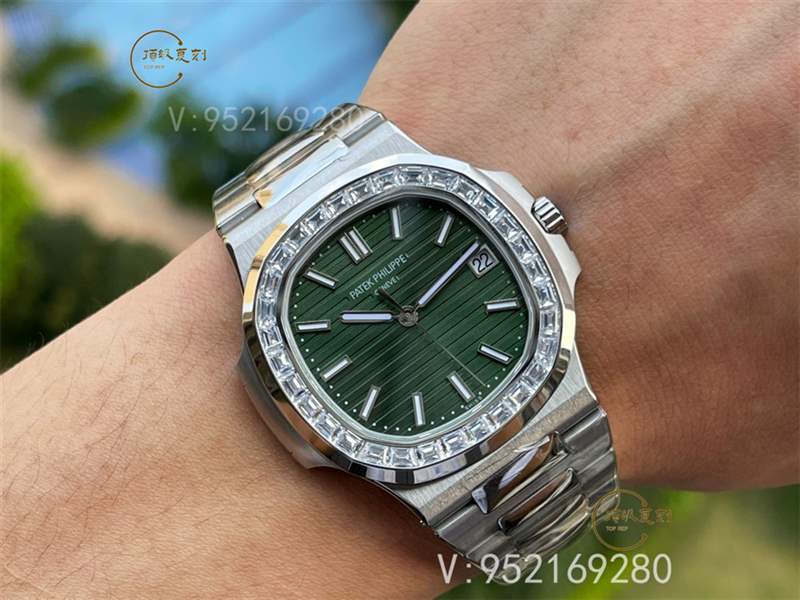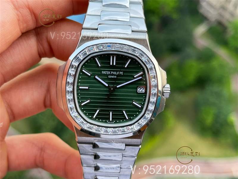 大家好,我是n廠手表小編,3k廠在推出324sc一體機之后,就成功占據了高端百達翡麗鸚鵡螺以及手雷的復刻市場,全力開發所有款式,在推出了3k廠鸚鵡螺綠盤5711之后,再次開發鉆圈版本綠盤鸚鵡螺復刻表,鑲嵌32顆頂級Wesselton長方形鉆石(約3.6克拉),按照珠寶工藝大師最高標準鑲嵌,令表身線條更顯出眾。當中精工細節:每顆長方形鉆石切割形狀特別略呈梯形,而非傳統長方形模樣,借此吻合八角形圓角表環輪廓。表面特色無與倫比,典型橫向凸紋裝飾,放射狀加工效果透現光華。白金小時刻度與巴頓式圓頭指針涂上夜光復合物料,確保日夜讀時清楚。表殼與綜合表鏈系在腕上恰到好處,穩妥舒適。全表可見人手拋光與磨拭加工元素細意交錯,倍顯線條交織效果。