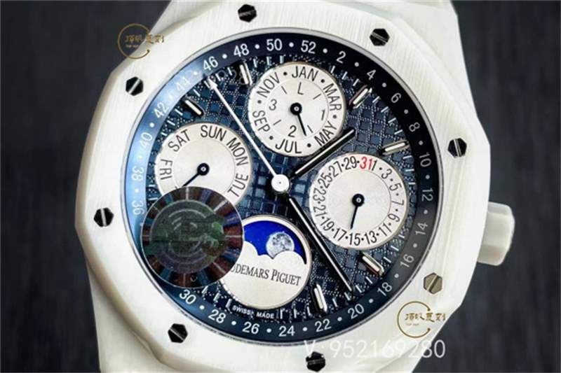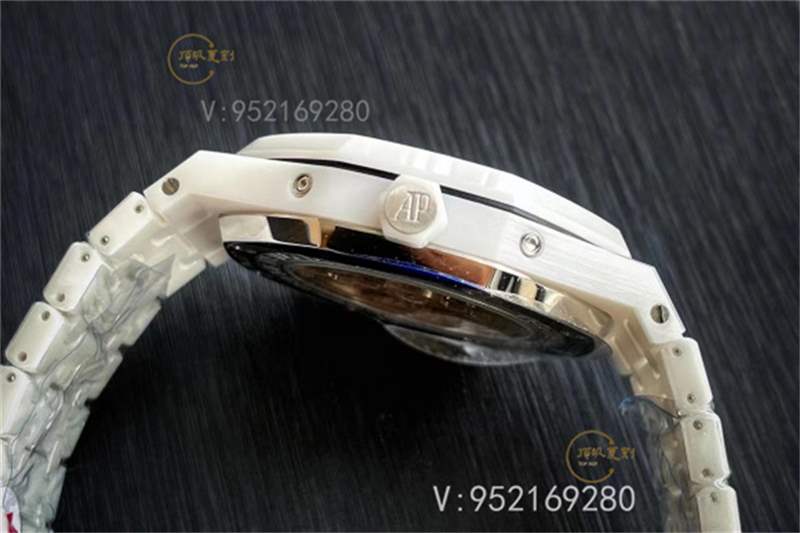 APS新品愛彼26579白陶瓷,皇家橡樹系列在“Grande Tapisserie”大格紋裝飾表盤上,日期、星期、月份、月相,和四個眼睛的位置與原裝同步,(區(qū)別普通版本四個眼鏡緊縮在一起)并以真實的月球圖像顯示天文精確月相,形成鮮明對比,直徑41mm,一體機(jī)5134自動上鏈機(jī)芯,厚度10.5mm(區(qū)別市面普通版本14mm )所有功能真實可用,更薄、更像 。