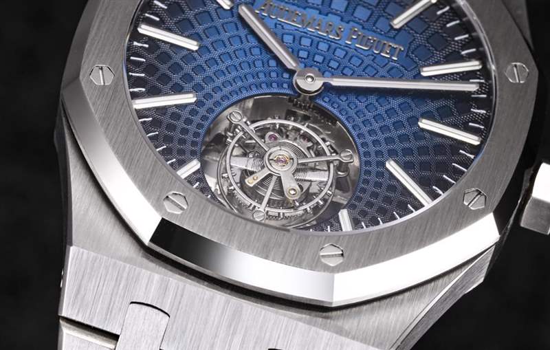 以愛彼26530ST藍面為例,依舊保留的八角形表圈、標志性的六角形螺絲以及經典表帶,尺寸41mm,大小比較符合國人佩戴習慣。