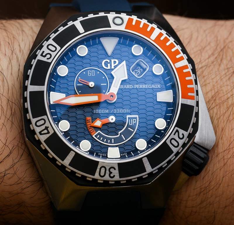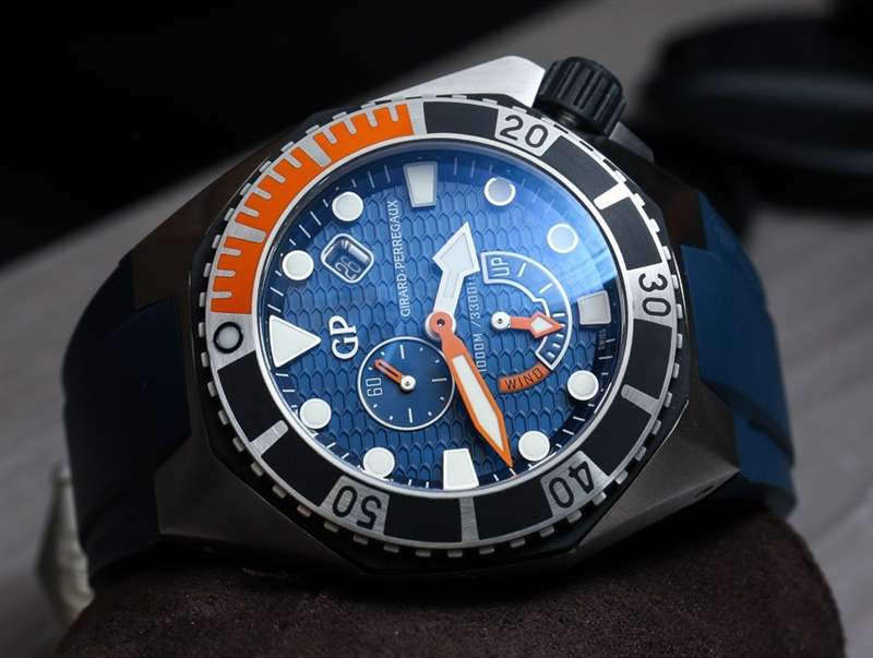 Girard-Perregaux Sea Hawk 表殼采用鋼材制成,尺寸為 44 毫米寬,但考慮到寬大的表耳和 17.1 毫米的表殼厚度,它確實(shí)磨損很大。表殼防水深度達(dá) 1000 米,帶有排氦閥,手表內(nèi)部是芝柏表自制的 GP03300-0074 自動機(jī)芯。它上面有一個(gè)模塊,提供額外的功能,如動力儲存指示器、日期和輔助秒盤。雖然不對稱,但表盤仍然很平衡。我也很喜歡帶有動力儲存指示器的潛水表。順便說一句,它具有 46 小時(shí)的動力儲存,并以 4 赫茲的頻率運(yùn)行。