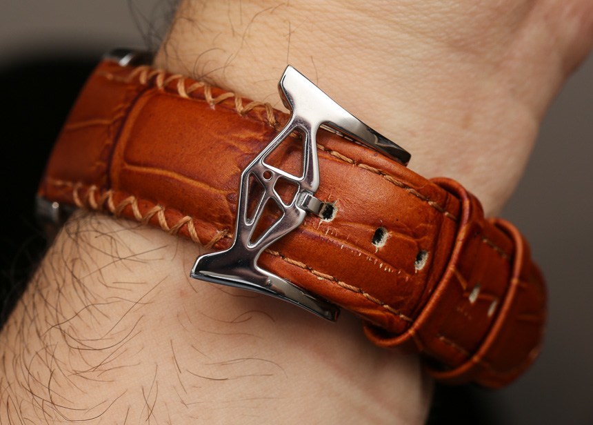 旋轉(zhuǎn)的“圓柱體”被應(yīng)用到表盤(pán)上,就像將自動(dòng)轉(zhuǎn)子設(shè)置在一圈滾珠軸承上一樣,而應(yīng)用的子彈頭產(chǎn)生失重以使其旋轉(zhuǎn)。在滾珠軸承組件的中間是設(shè)置時(shí)針和分針的地方——再次使用了新的東西。在這里你有全新的和相當(dāng)經(jīng)典的手,這也是我不希望從 ArtyA 看到的東西。我想隨著 Arpa 的成熟,他會(huì)變得更加傳統(tǒng)……一個(gè)很酷的細(xì)節(jié)讓整個(gè)設(shè)計(jì)回歸到它的滾動(dòng)精神是表帶扣的樣式,以及表帶上的十字交叉縫線(xiàn)。