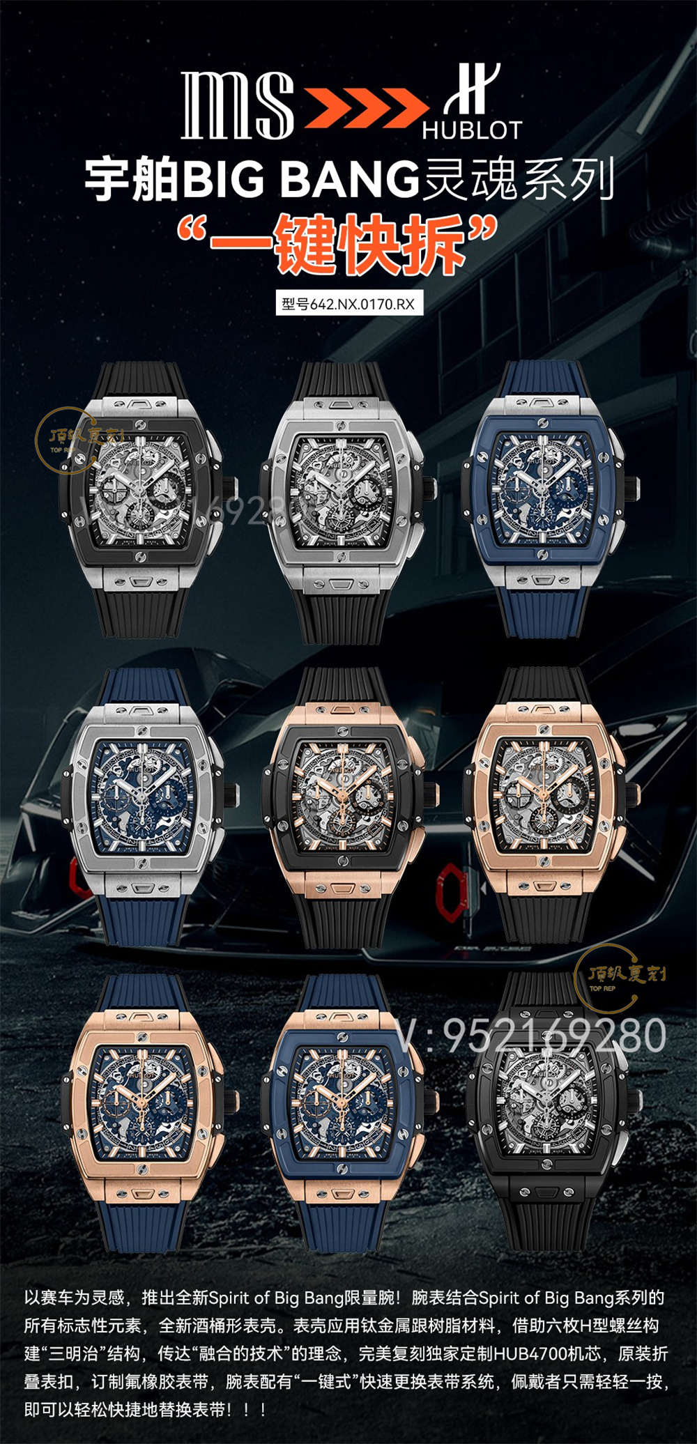 宇舶BIG BANG Spirit of Big Bang系列642.NX.0170.RX(多顏色選配)以賽車為靈感,推出全新Spirit of Big Bang限量腕!腕表結合的所有標志性元素,全新酒桶形表殼。表殼應用鈦金屬跟樹脂材料,借助六枚H型螺絲構建“三明治”結構,傳達“融合的技術”的理念,完美復刻獨家定制HUB4700機芯,原裝折疊表扣,訂制氟橡膠表帶,腕表配有“一鍵式”快速更換表帶系統,佩戴者只需輕輕一按,即可以輕松快捷地替換表帶。