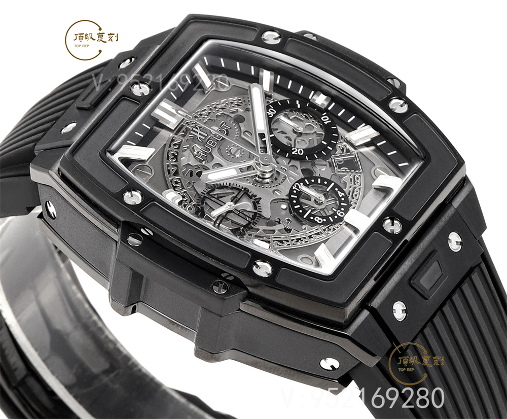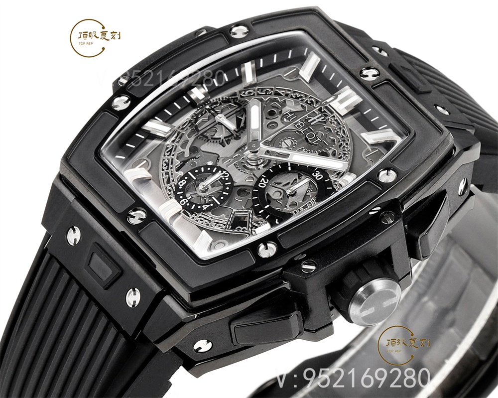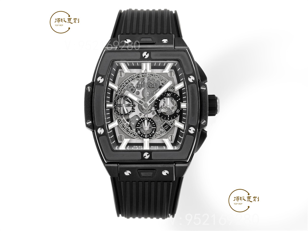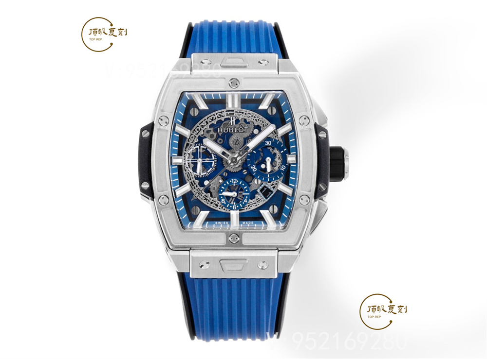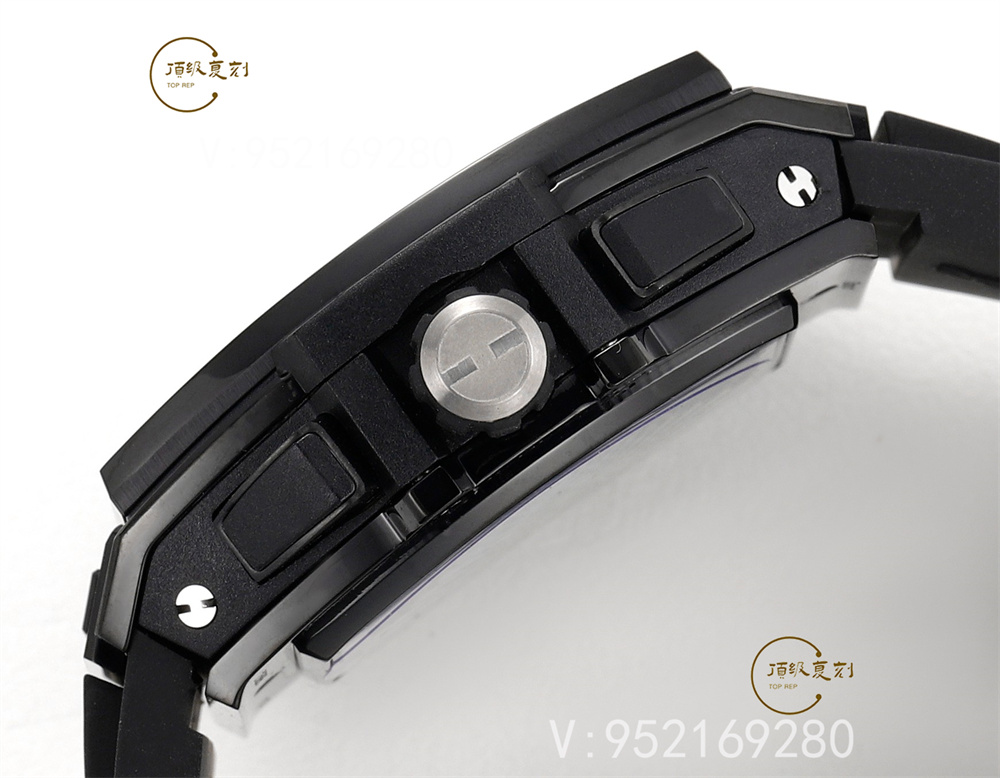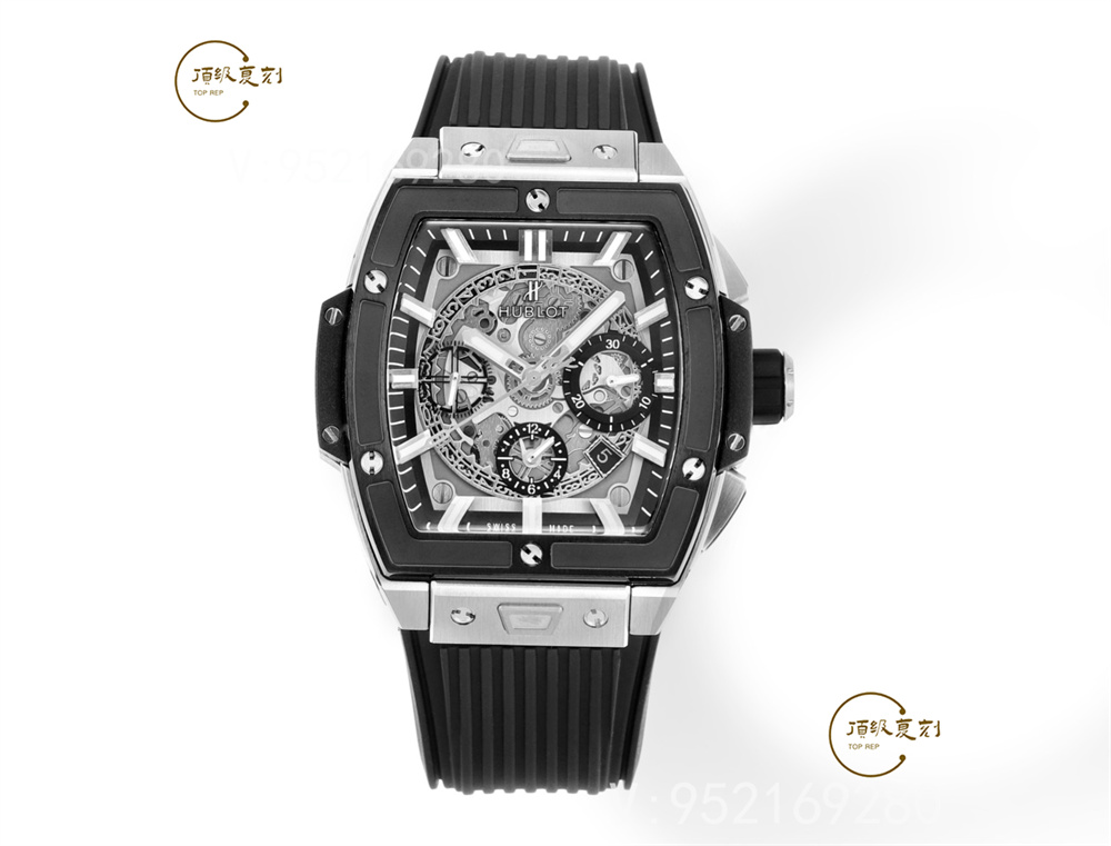 整表采用宇舶最具代表的H形螺絲(如果大家要玩拆解的話某寶很多專拆宇舶的螺工具),表殼主體為鈦金屬材質,透明藍寶石盤面顯露出裸露的機芯,整體混為一體,強烈的金屬質感,外加立體多層次的元素組合,大家可以參考鐵血戰士這個電影,這個表采用的元素很多是來自于哪個靈感!硬暴力美學設計,凸起的肌肉線條!搭配藍寶石水晶玻璃表鏡,表冠采用鈦金屬與橡膠材質制成,表全透設計!正品機芯采用HUB 4700機芯,動力儲備為50個小時,復刻版本采用7750機芯代替,滿動力也是四十多小時(配合手動上鏈)。