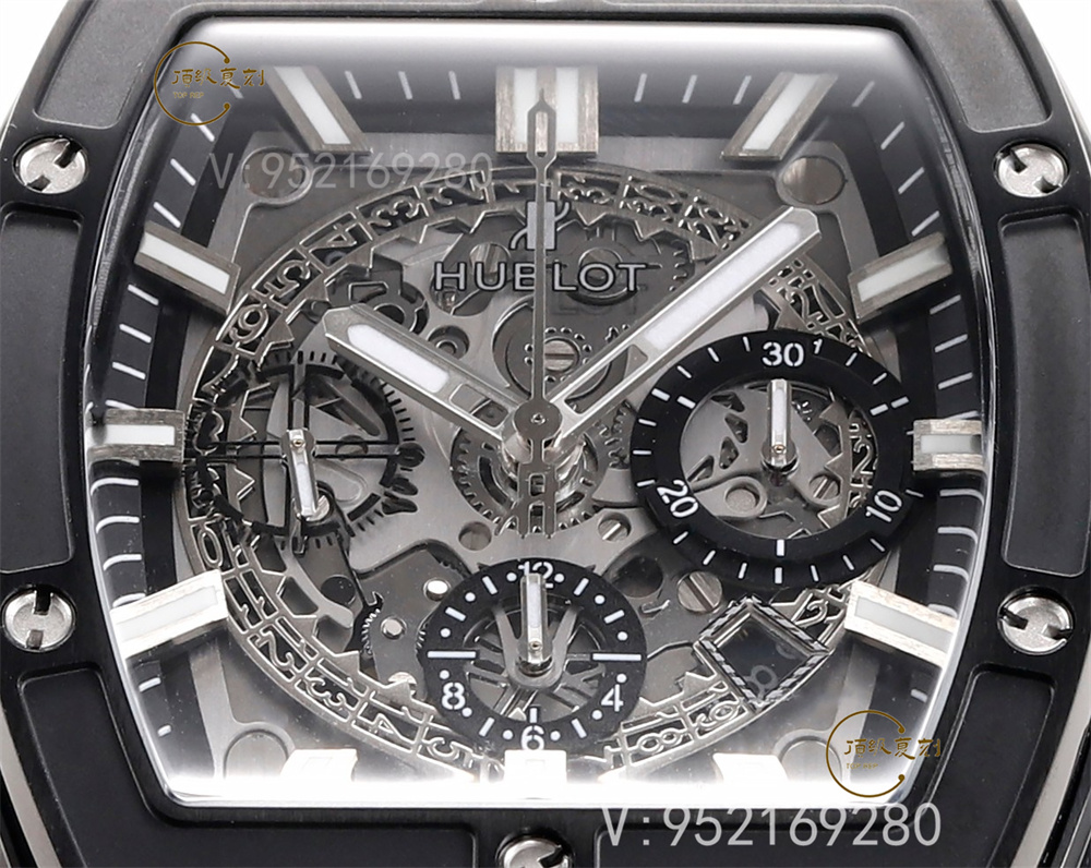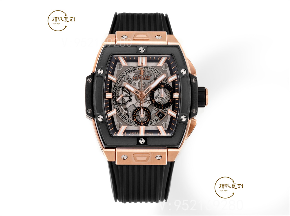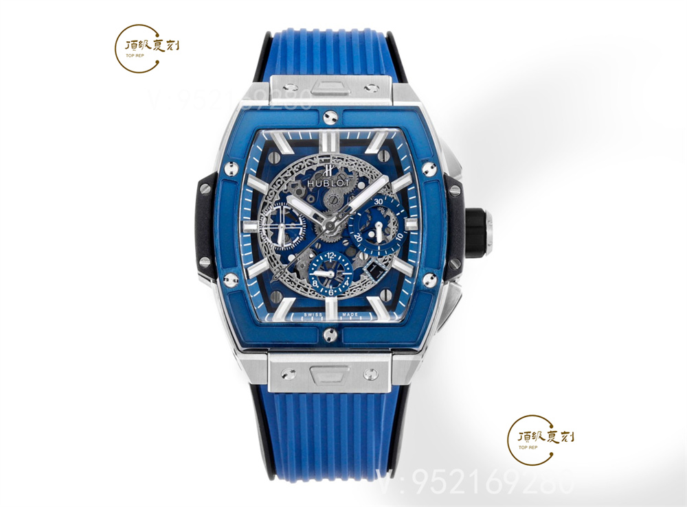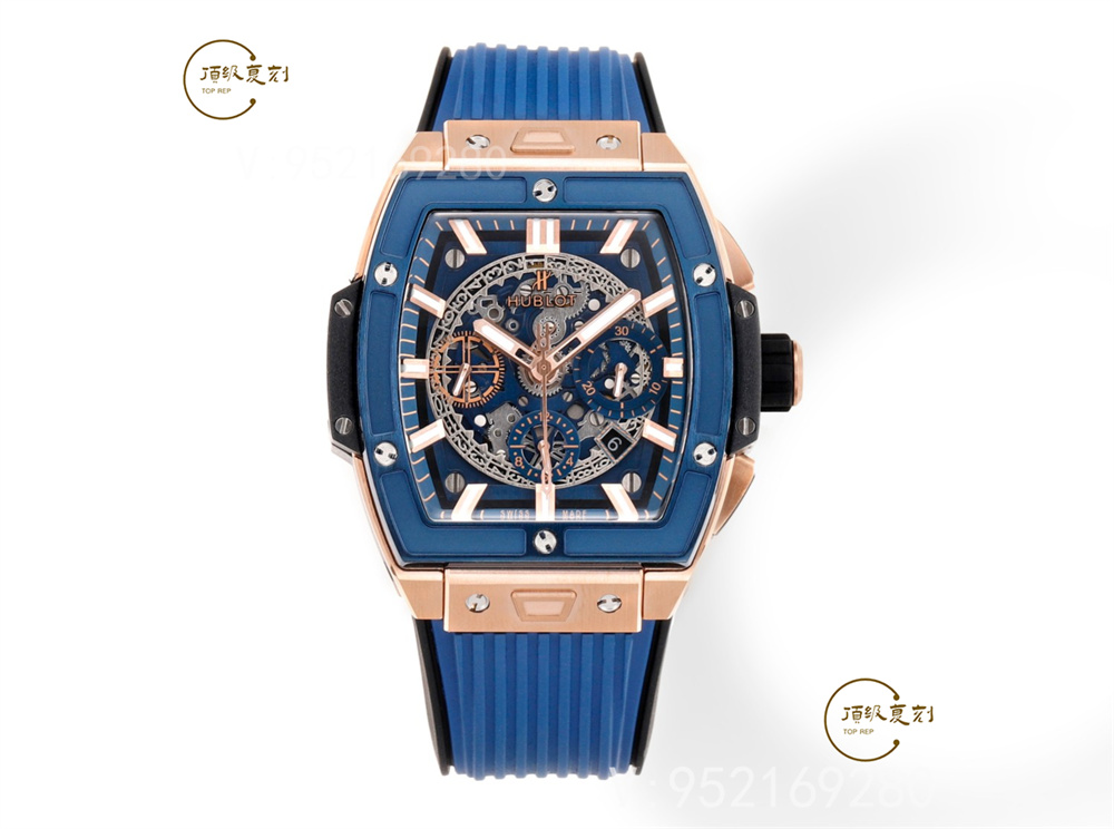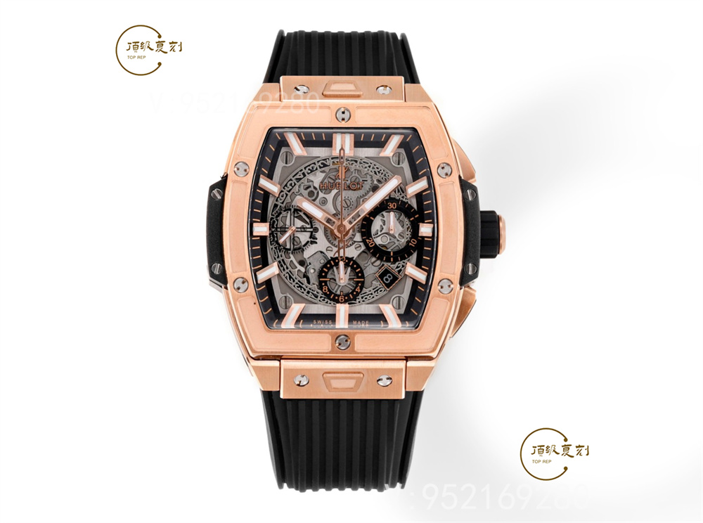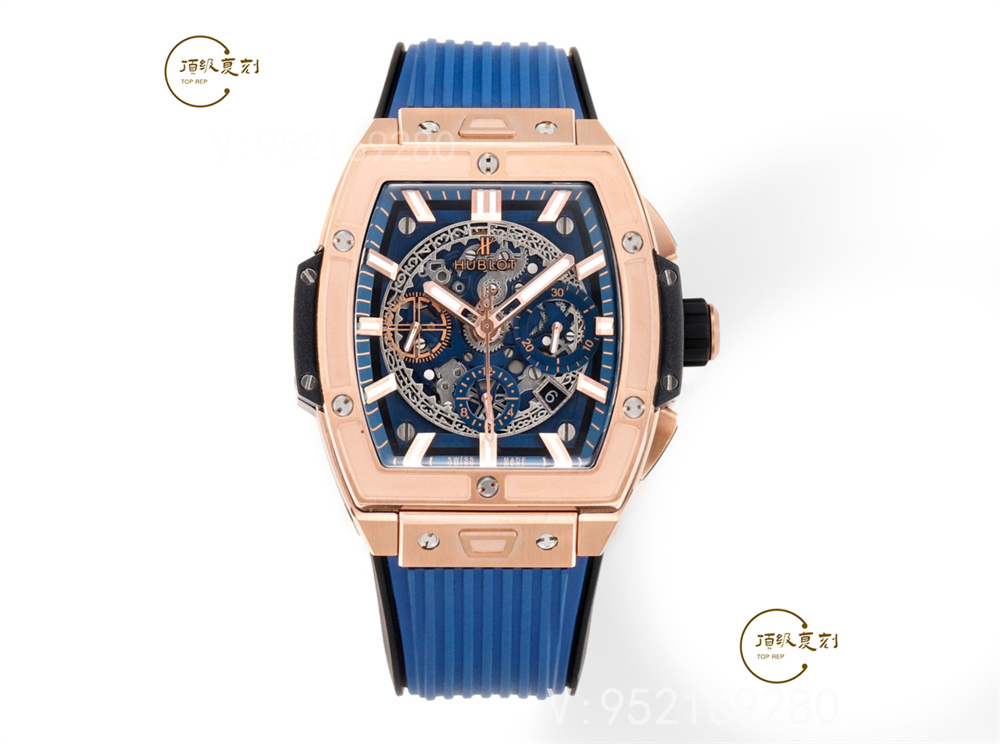 整表采用宇舶最具代表的H形螺絲(如果大家要玩拆解的話某寶很多專拆宇舶的螺工具),表殼主體為鈦金屬材質,透明藍寶石盤面顯露出裸露的機芯,整體混為一體,強烈的金屬質感,外加立體多層次的元素組合,大家可以參考鐵血戰士這個電影,這個表采用的元素很多是來自于哪個靈感!硬暴力美學設計,凸起的肌肉線條!搭配藍寶石水晶玻璃表鏡,表冠采用鈦金屬與橡膠材質制成,表全透設計!正品機芯采用HUB 4700機芯,動力儲備為50個小時,復刻版本采用7750機芯代替,滿動力也是四十多小時(配合手動上鏈)。