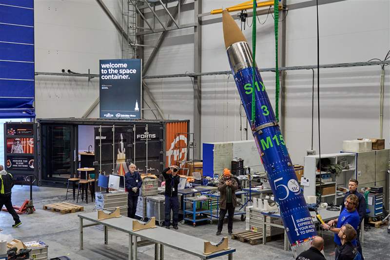 Fortis 團(tuán)隊(duì)的一部分以及 SSC 機(jī)組人員和其他參與的工程師和科學(xué)家,在組裝好的 S1X-3 火箭旁邊。