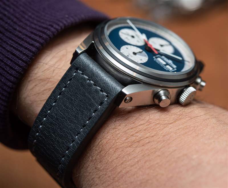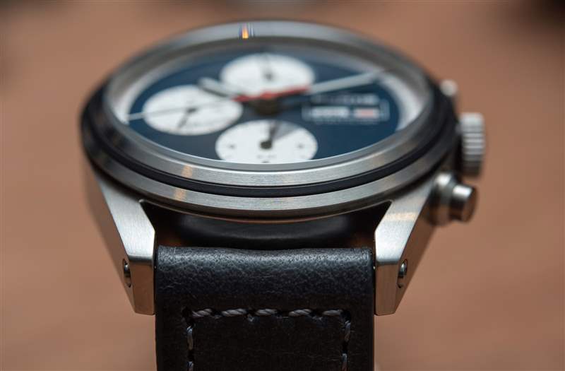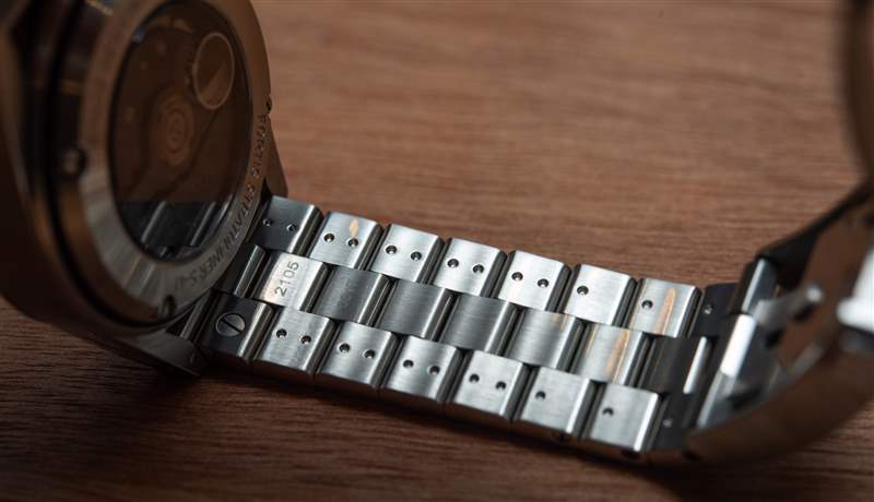 41 毫米寬的表殼采用再生不銹鋼制成,在金屬中觀看時(shí)最能欣賞到美感。塊狀表耳以強(qiáng)烈的曲線打造出平流層的輪廓,配有兩個(gè)倒置的按鈕和被橡膠條分成兩半的表圈。就像表盤(pán)一樣,表殼乍一看也很簡(jiǎn)單——可以說(shuō)太簡(jiǎn)單了,但這種設(shè)計(jì)會(huì)通過(guò)長(zhǎng)時(shí)間的佩戴展現(xiàn)出經(jīng)過(guò)深思熟慮的新細(xì)節(jié)。表殼和表鏈感覺(jué)可以使用很長(zhǎng)時(shí)間——不僅僅是因?yàn)樗鼈兊膲K狀設(shè)計(jì),還因?yàn)樗鼈兊馁N合度和表面處理。一個(gè)典型的例子是帶有三個(gè)墊圈的旋入式表冠,按鈕的精確配合保證了 200m(660ft)的防水性能,這適合在真正的手表愛(ài)好者的監(jiān)督下制造的手表。