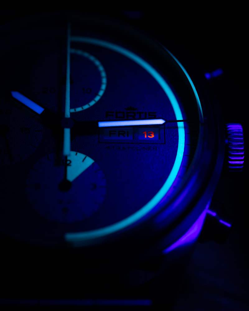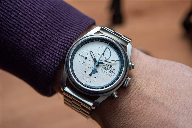 Stratoliner 有多種表盤(pán)組合可供選擇,就連貫性和獨(dú)特性的理想融合而言,極地白色和藍(lán)色表盤(pán)可能是其中最好的。Fortis 為其表盤(pán)的纖薄而感到自豪,而且小表盤(pán)是平坦的,而不是凹陷的;日期和星期顯示都比平常更清晰,更靠近水晶。指針大而易讀,具有強(qiáng)烈的夜光和黑色輪廓,注射器式分針以精致的刻度準(zhǔn)確地指示分鐘。雖然繁忙的秒針刻度非常適合準(zhǔn)確讀取計(jì)時(shí)秒針,但它使分鐘的讀取變得復(fù)雜。由于每隔五個(gè)位置沒(méi)有一個(gè)大的時(shí)標(biāo),因此以分鐘的精度報(bào)時(shí)需要一些時(shí)間來(lái)適應(yīng)。