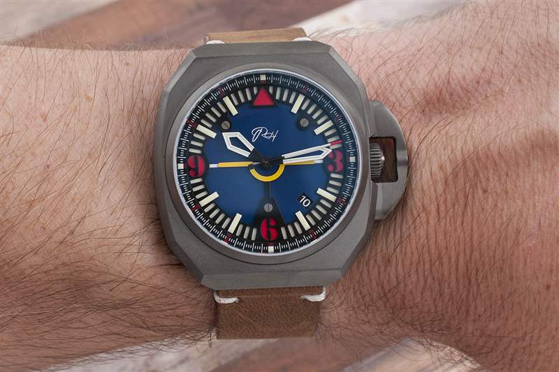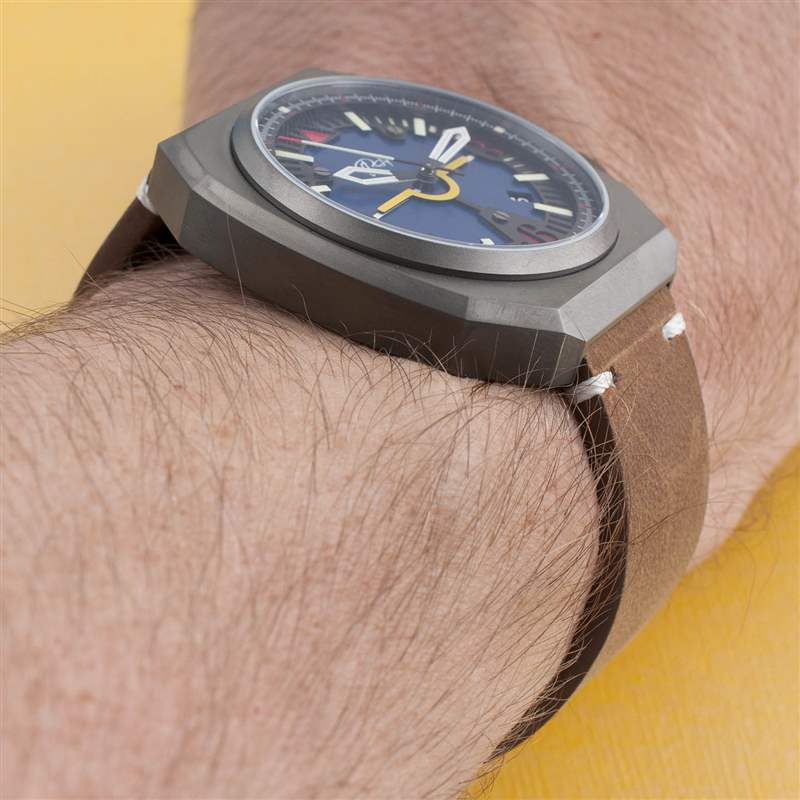 然而,表冠護罩使手表佩戴起來比其 42.5 毫米寬的尺寸讓您相信的要大。表殼也接近正方形,這使得它比圓形手表占用的空間更大(想想對角線測量,就像電腦顯示器一樣)。盡管如此,其無表耳設計使其適合較小的手腕佩戴,因為表耳至表耳的長度僅為 47 毫米。大多數人還會發現其 13.1 毫米的整體厚度也很適合佩戴,20 毫米的表耳寬度意味著您最喜歡的所有表帶都可以裝在上面。