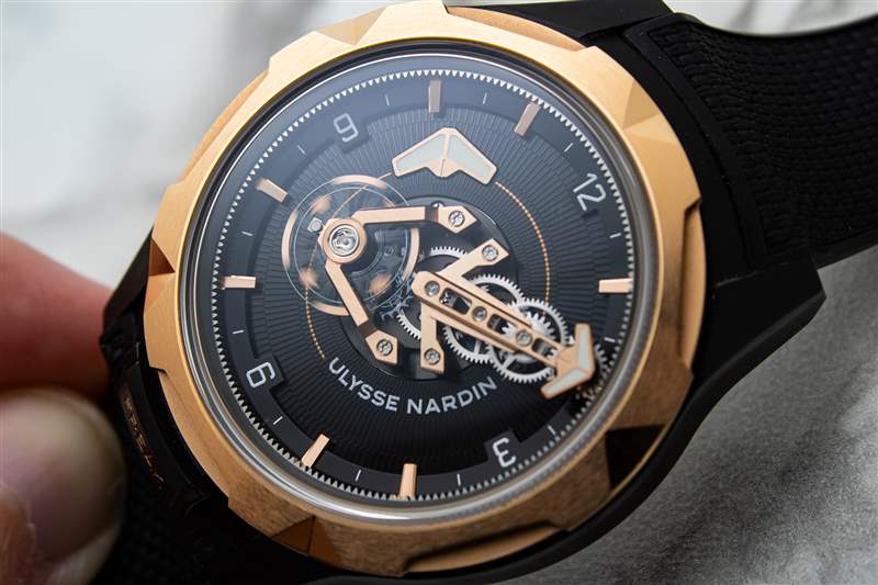 與表殼一樣,雅典表 Freak ONE 的鏤空表盤以之前的 Freak 型號為基礎,但以更簡潔、更精致的方式呈現(xiàn)了這些概念。嚴格來說,只有帶有淺色印刷阿拉伯數(shù)字和鑲貼金質時標的狹窄外圈是真正的表盤表面,藍寶石水晶下方的所有其他部件都是機芯部件。大部分空間被一個寬大的啞光黑色圓盤占據(jù),圓盤上有精致的脊狀紋理,并印有雅典表的文字標志。由于此處采用寬大且?guī)в写罅恳构獾慕鹕切涡螤?,該旋轉圓盤可用作時針。然而,真正搶盡風頭的是分針。這是 Freak 系列的標志性碟形盤,這是一個旋轉齒輪系組件,每小時在表盤上繞一圈,本質上允許機芯,圍繞自身旋轉。與之前的 Freak 迭代相比,該組件在視覺上顯著簡化,但 Ulysse Nardin 在形式上添加了對其自身傳統(tǒng)的厚顏無恥的認可。包含齒輪系組件和分鐘標記的主橋結構也形成了該品牌的標志性錨徽。錨標志出現(xiàn)的唯一其他地方是表帶襯里,這使得這是一個令人印象深刻的克制品牌活動。飛行擺輪橋作為分針的配重,與鏤空表盤表面上方的齒輪系一起旋轉,成為動態(tài)的視覺亮點。此外,由于擒縱機構安裝在旋轉組件上,F(xiàn)reak ONE 在技術上還具備 60 分鐘陀飛輪復雜功能。這是最頑固的運動書呆子們的話題,