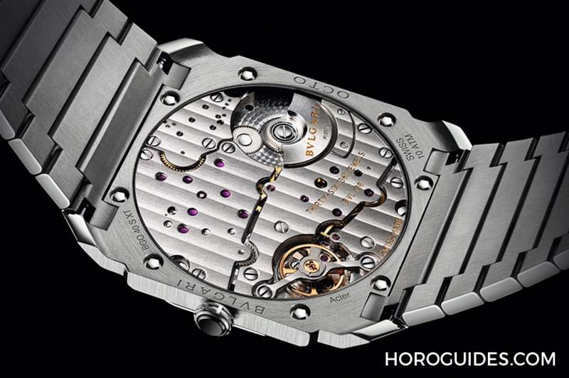 此表款所搭載的自動上鏈機械機芯BVL138 Finissimo,具備時針、分針、小秒針顯示,60小時動力儲存,機芯飾有日內瓦波紋圖案、倒角橋板與珍珠圓點打磨紋底板,寶格麗還講究地以鉑金材質打造微型自動盤,在隱微處藏了唯有配戴者才欣賞得到的奢華律動。