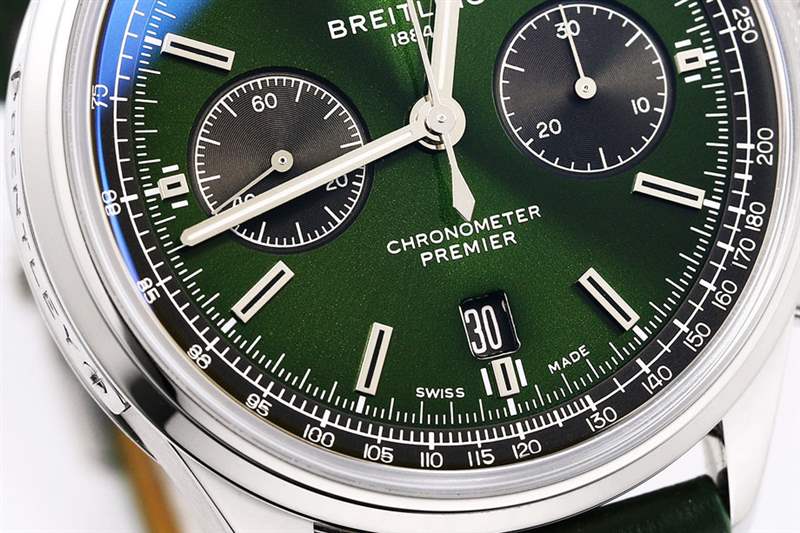 GF廠也是推出了四個顏色的字面,百年靈璞雅系列的風格偏向于優雅運動,這款計時碼表也是,在優雅的運動之間達到平衡!而這一次小白你介紹的這款復刻腕表得到表盤是GF廠還原了正品腕表那醒目亮眼的英國賽車綠作為主色!