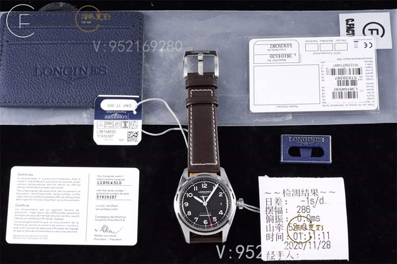 【品控】CF團隊近乎苛刻的嚴謹品控,每枚機芯的品控從源頭出發(fā),每一只腕表出廠前都經(jīng)CF制表師調(diào)試至最佳狀態(tài)并附帶機芯檢測報告單一份,隨表附送正品一致的頭層牛皮皮套與五碼合一。 CF始終堅持初心,追求完美!將持續(xù)為各界表友打造原單品質(zhì)的浪琴腕表副本。CF廠只做浪琴的工匠工廠!